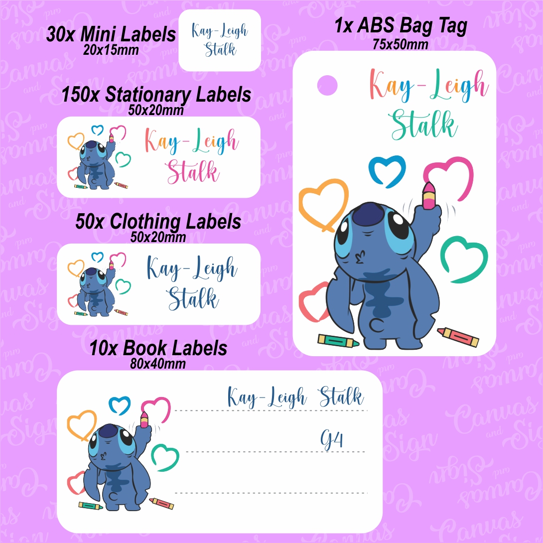 Our school labels are the most cost effective way of marking everything from Stationery to Clothes. We have compiled our list according to the school stationery lists in our area with some extra! These are easy to use making your life a breeze. Plus we pack them in a Lunchbox premarket with your personal label. Our Combo consist of: