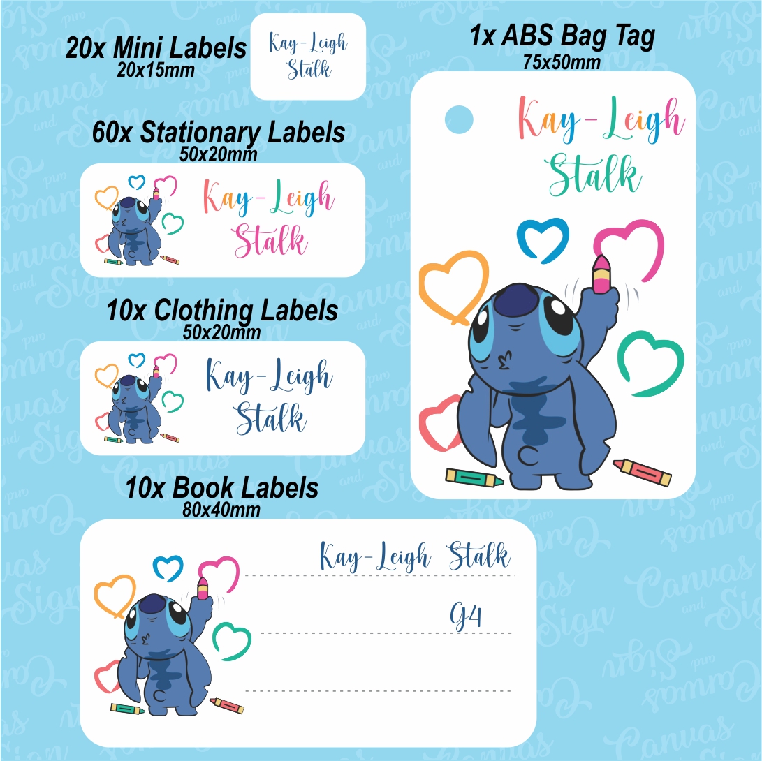 Our school labels are the most cost effective way of marking everything from Stationery to Clothes. We have compiled our list according to the school stationery lists in our area with some extra! These are easy to use making your life a breeze. Plus we pack them in a Lunch box premarket with your personal label. Our Combo consist of :