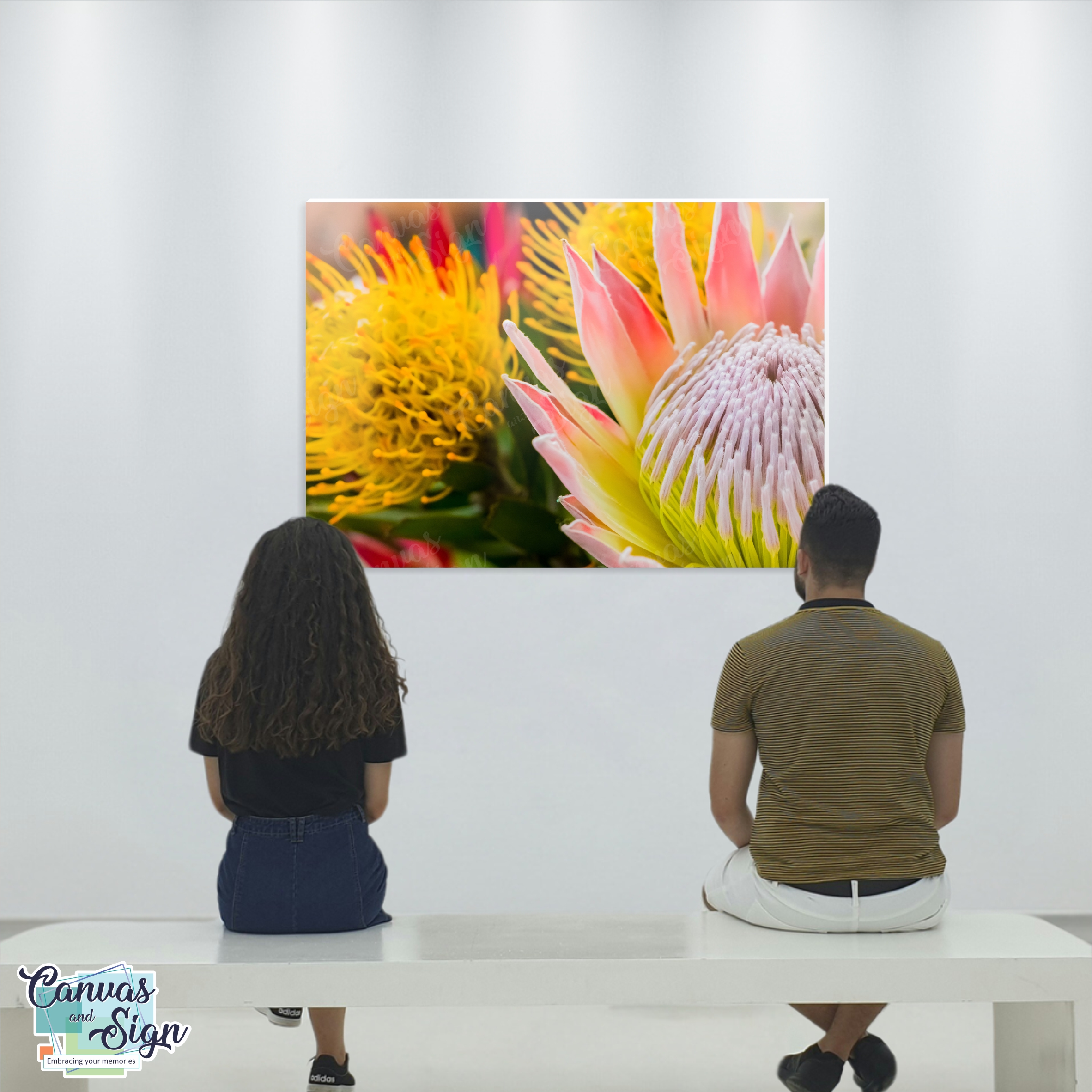 We print on 280gsm poly cotton canvas material and offer it in matt or satin gloss.