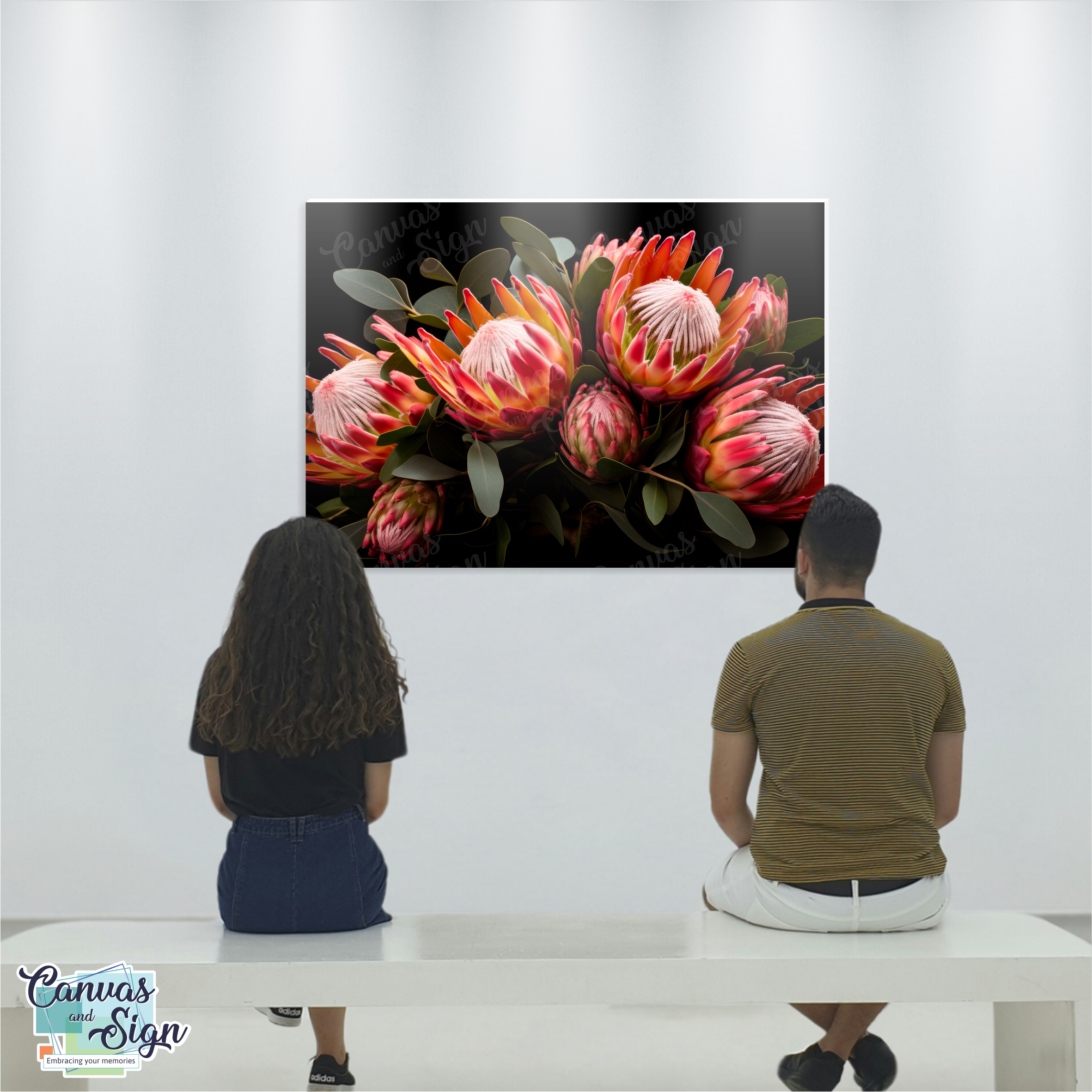 We print on 280gsm poly cotton canvas material and offer it in matt or satin gloss.