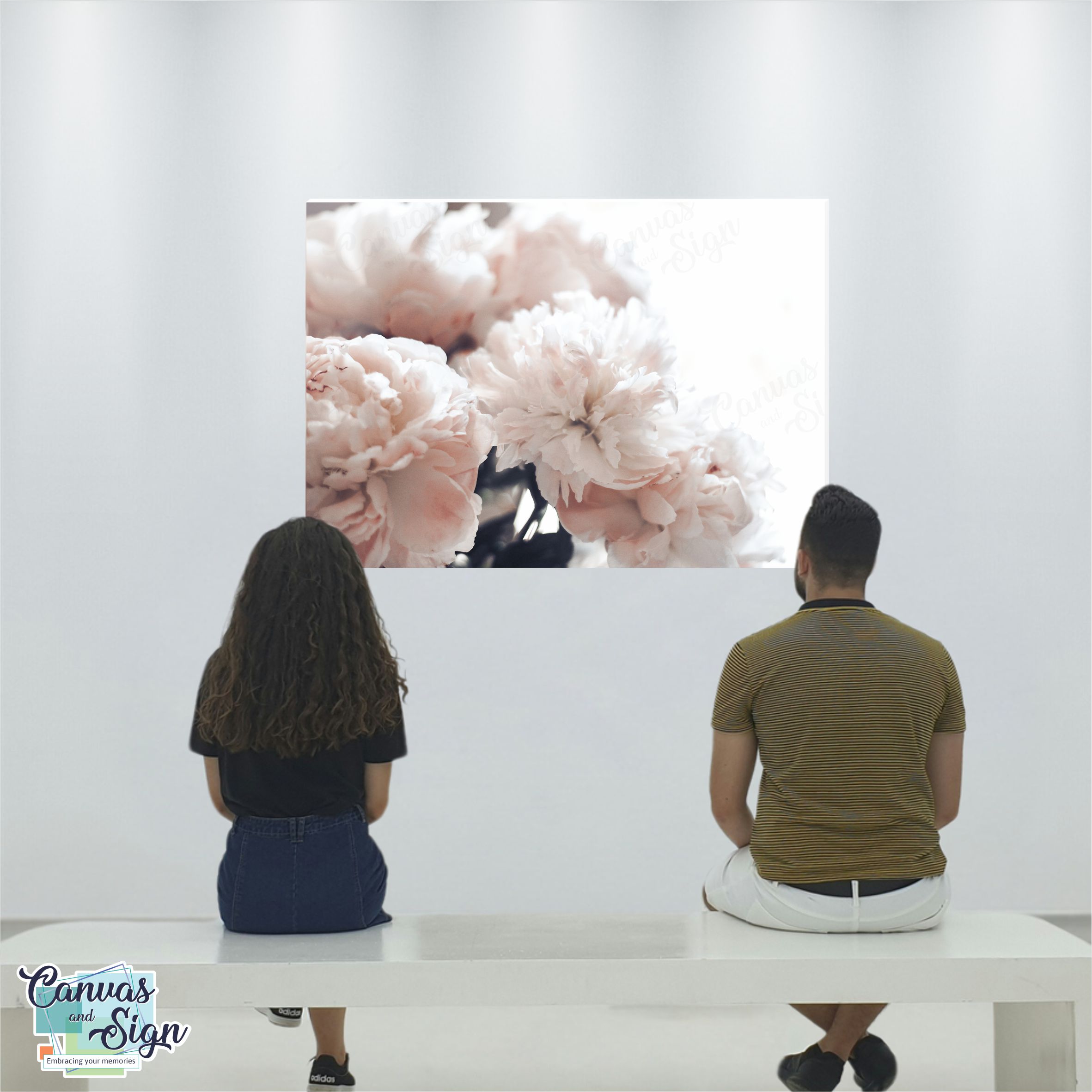 We print on 280gsm poly cotton canvas material and offer it in matt or satin gloss.